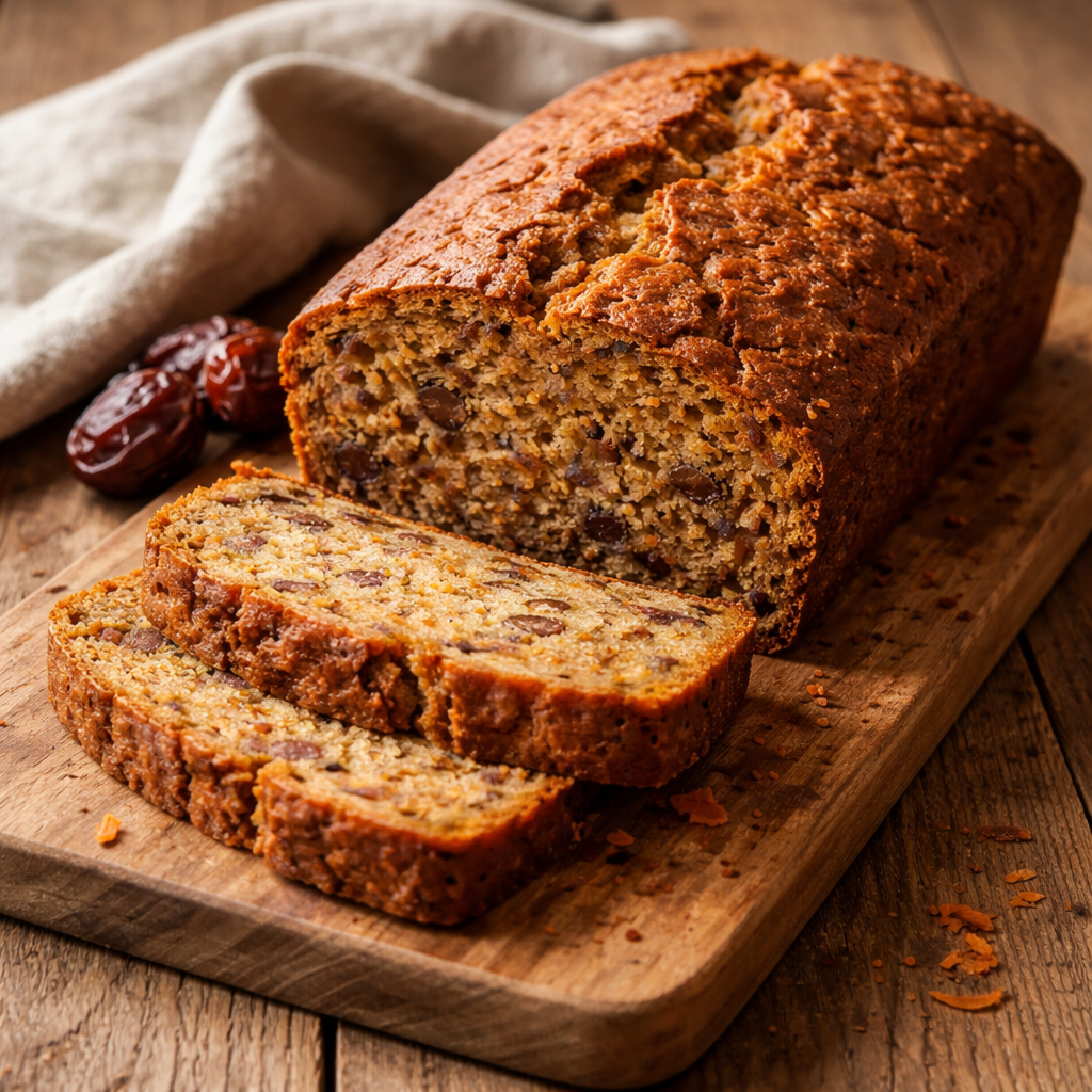* Voor een mooie bovenkant: strooi geraspte kokos of plakjes dadel over het beslag vóór het bakken.
