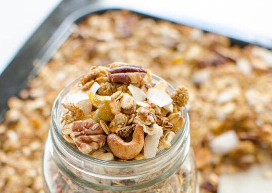 Knapperige granola met een diepe karamelsmaak van dadelsiroop en honing, vol noten en mooie grove clusters. Porties Ongeveer 8 porties Bereidingstijd 10 minuten Baktijd 20 minuten Totale tijd 30 minuten.